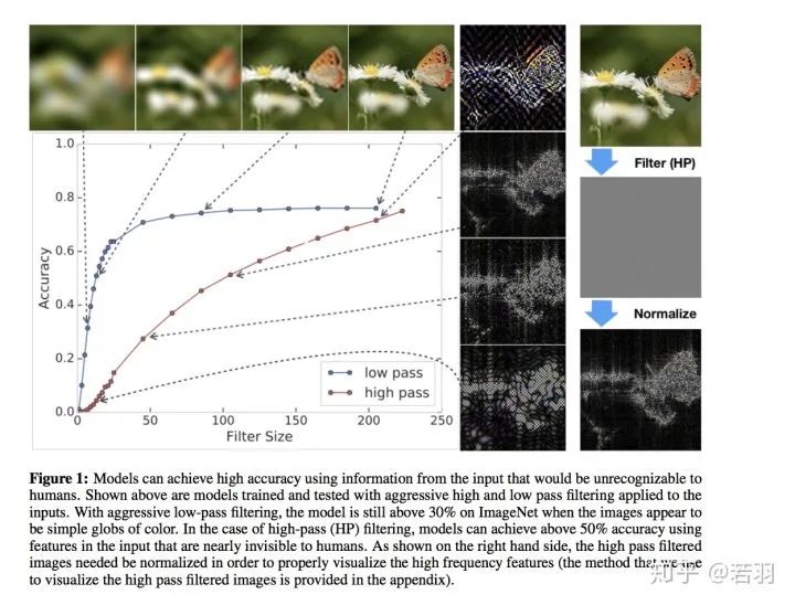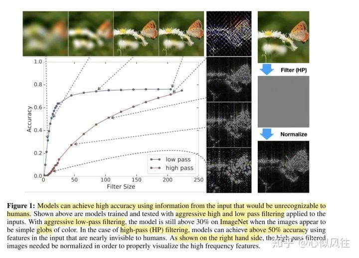 图片说明翻译:使用人类无法识别的输入信息,模型可以实现高精度。上面显示的是经过训练和测试的模型,这些模型在输入端应用了严格的高通和低通滤波。通过积极的低通滤波,当图像看起来是简单的彩色球体时,该模型在ImageNet上仍然高于30%。在高通(HP)过滤的情况下,使用人类几乎看不见的输入特征,模型可以达到50%以上的精度。如右图所示,需要对高通滤波图像进行归一化处理,以便正确地可视化高频特征(我们用附录中提供的可视化高通滤波图像的方法)。