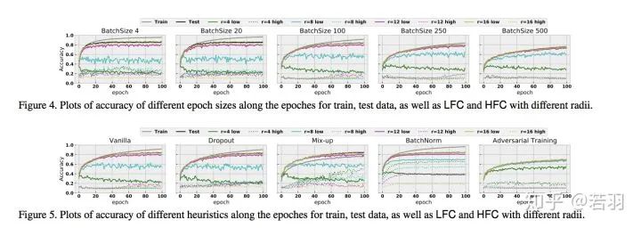上面的图表说明:即使低通滤波器的大小非常小,图像看起来就像色块一样,人眼根本分不清是什么,模型依然取得了超过30%的准确性(低通滤波器得出的第一张图)。而对于高通滤波的部分(从上往下第二张图),即使人眼根本分不出这张图里是什么东西,模型依然取得了50%准确性。而且在低频信息少时,增加低频信息能快速提高准确性,当到达一定量时就不再影响了;高频信息对准确性的影响是逐渐提升的,没有低频快。