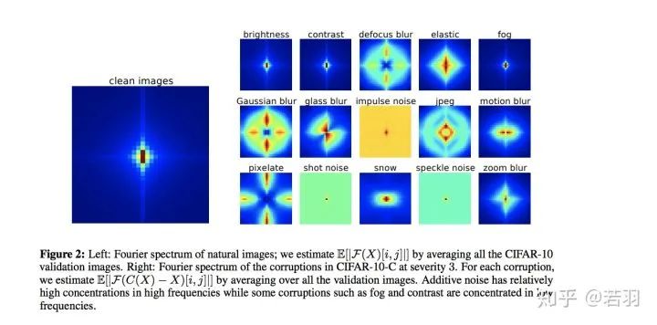 图片说明翻译:左:自然图像的傅里叶谱;我们通过平均所有CIFAR-10验证图像来估计E[|F(X)[i,j]|]。右:CIFAR-10-C中严重程度为3的腐败的傅里叶谱。对于每个腐败,我们通过平均所有验证图像来估计E[|F(C(X)−X)[i,j]|]。加性噪声在高频段具有较高的浓度,而雾、对比度等污染集中在低频段。