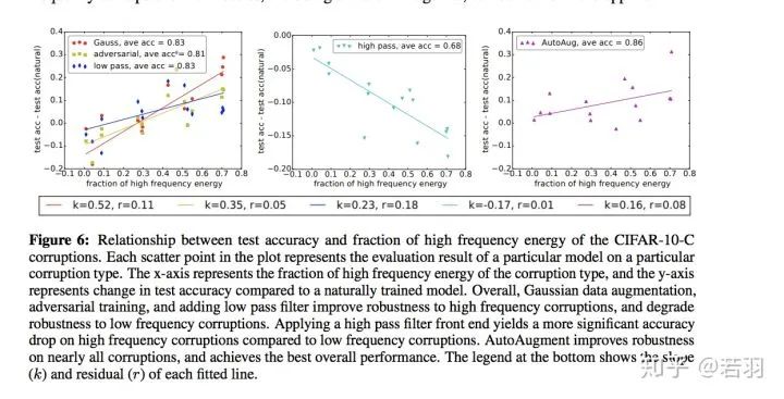 图片翻译说明:CIFAR-10-C腐蚀高频能量分数与测试精度的关系。绘图中的每个散布点代表特定模型对特定损坏类型的评估结果。X轴表示损坏类型的高频能量的分数,y轴表示与自然训练的模型相比测试精度的变化。总体而言,高斯数据增强、对抗性训练和添加低通滤波器提高了对高频破坏的鲁棒性,降低了对低频破坏的鲁棒性。与低频损坏相比,应用高通滤波器前端对高频损坏产生更显著的精度下降。AutoAugment提高了对几乎所有损坏的健壮性,并实现了最佳的整体性能。底部的图例显示了每条拟合线的斜率(K)和残差(r)。