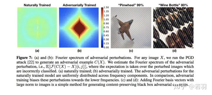 图片翻译说明:(a)和(b):对抗扰动的傅立叶频谱,给定图片X,发起PGD攻击,得到对抗样本C(X),估算对抗扰动的傅立叶频谱,会使得图片错误分类;(a) 是自然训练得到的频谱;(b)是对抗训练得到的频谱。自然训练模型的对抗性扰动均匀分布在频率分量上。相比之下,对抗性的训练使这些扰动偏向较低的频率。(C)和(D):将范数大的傅立叶基向量加到图像上是一种生成内容保持黑盒对抗性示例的简单方法。