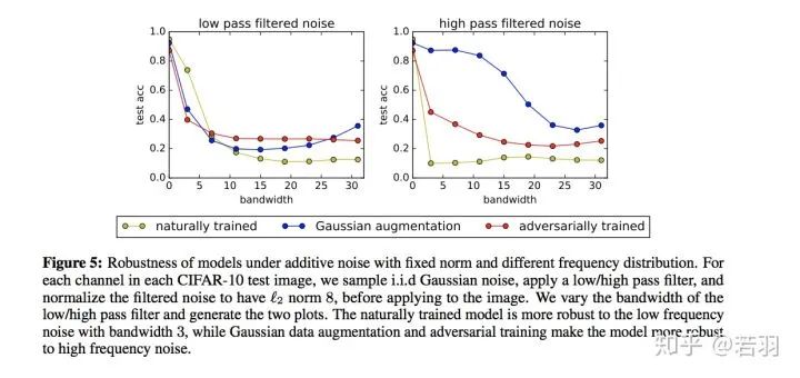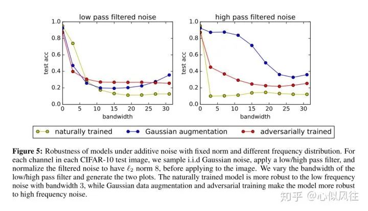 图片翻译说明:固定范数和不同频率分布的加性噪声下模型的稳健性。对于每个CIFAR-10测试图像中的每个通道,在应用到图像之前,我们对独立同分布高斯噪声进行采样,应用低/高通滤波器,并将滤波后的噪声归一化为L2范数值为8。我们改变低/高通滤波器的带宽,生成两个曲线图。自然训练的模型对带宽为3的低频噪声具有更强的鲁棒性,而高斯数据增强和对抗性训练使模型对高频噪声具有更强的鲁棒性。