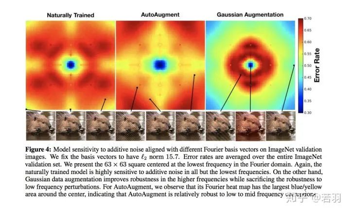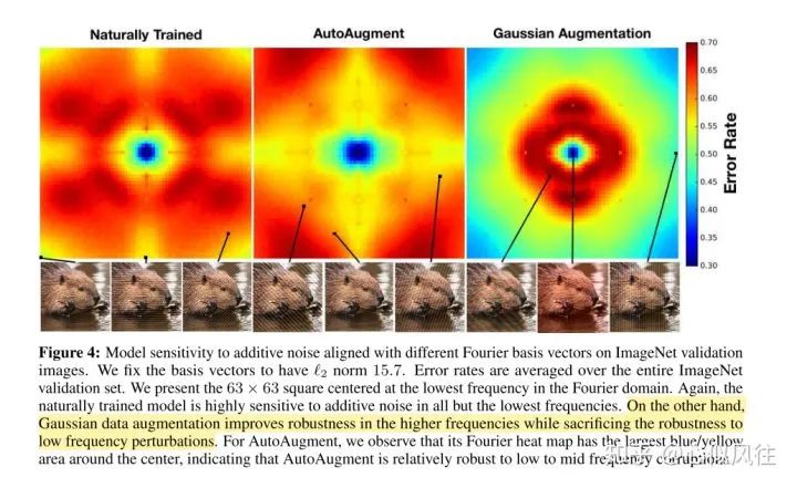 图片翻译说明:ImageNet验证图像上的不同傅立叶基向量对加性噪声的模型敏感度。我们将基向量固定为L2范数的值等于15.7。错误率是整个ImageNet验证集的平均错误率。给出了以傅里叶域最低频率为中心的63×63平方。同样,自然训练的模型对除最低频率之外的所有加性噪声都高度敏感。另一方面,高斯数据增强提高了高频下的鲁棒性,同时牺牲了对低频扰动的鲁棒性。对于AutoAugment,我们观察到它的傅立叶热图在中心周围有最大的蓝色/黄色区域,这表明AutoAugment对低频到中频的破坏是相对健壮的。
