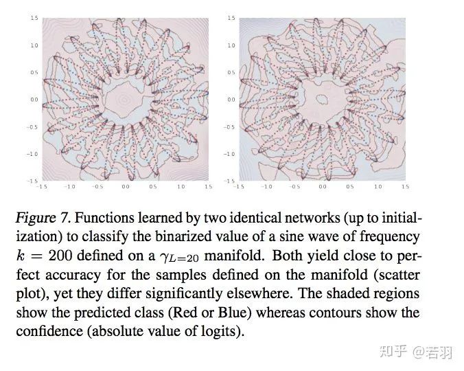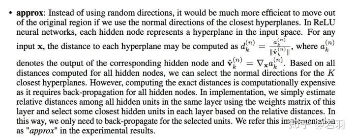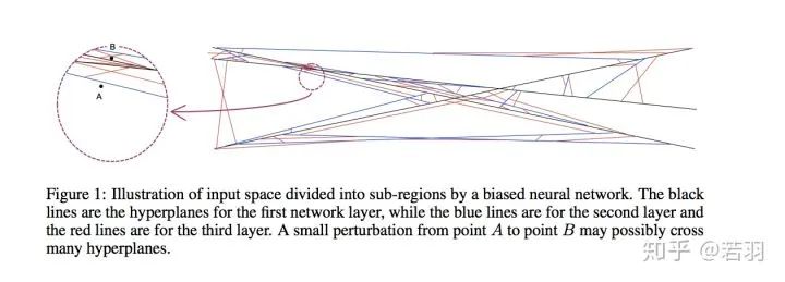 对于N=1000个节点的隐藏层,并且输入维度为n=200时,区域的最大数目大致等于10^200。换言之,即使是一个中等规模的神经网络也可以将输入空间划分为大量的子区域,这很容易超过宇宙中的原子总数。当我们学习神经网络时,我们不能期望每个区域内至少有一个样本。对于那些没有任何训练样本的区域,其中的结果线性函数可以是任意的,因为它们根本不对训练目标函数有贡献。当然,这些地区中的大多数都非常小。当我们测量整个空间的预期损失函数时,它们的贡献可以忽略不计,因为随机抽样点落入这些微小区域的机会非常小。然而,对抗性攻击带来了新的挑战,因为对抗性样本不是自然抽样的。考虑到区域的总数是巨大的,那么这些微小的区域在输入空间中几乎无处不在。对于输入空间中的任何一个数据点,我们几乎肯定可以找到这样一个微小的区域,其中线性函数是任意的。如果选择了这个微小区域内的一个点,神经网络的输出可能会出乎意料。这些微小的区域是神经网络易受敌意攻击的根本原因。