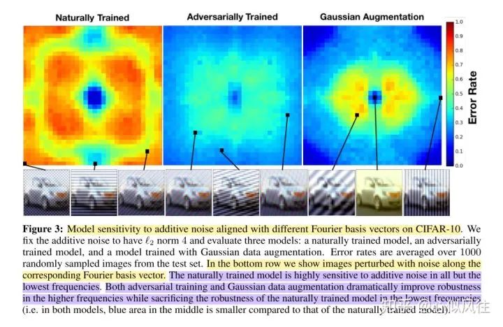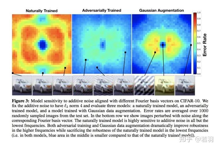 图片翻译说明:CIFAR-10上不同傅立叶基向量对加性噪声的模型灵敏度。我们将加性噪声固定为“L2范数为4”,并评估了三个模型:自然训练模型、对抗训练模型和高斯数据增强训练模型。对来自测试集中的1000个随机采样的图像进行平均错误率。在最下面的一行中,我们显示了沿着相应的傅立叶基向量受到噪声干扰的图像。自然训练的模型对除最低频率以外的所有加性噪声都高度敏感。对抗性训练和高斯数据增强都极大地提高了高频下的鲁棒性,而牺牲了自然训练模型在低频率下的鲁棒性(即,在这两个模型中,中间的蓝色区域比自然训练模型的小)。