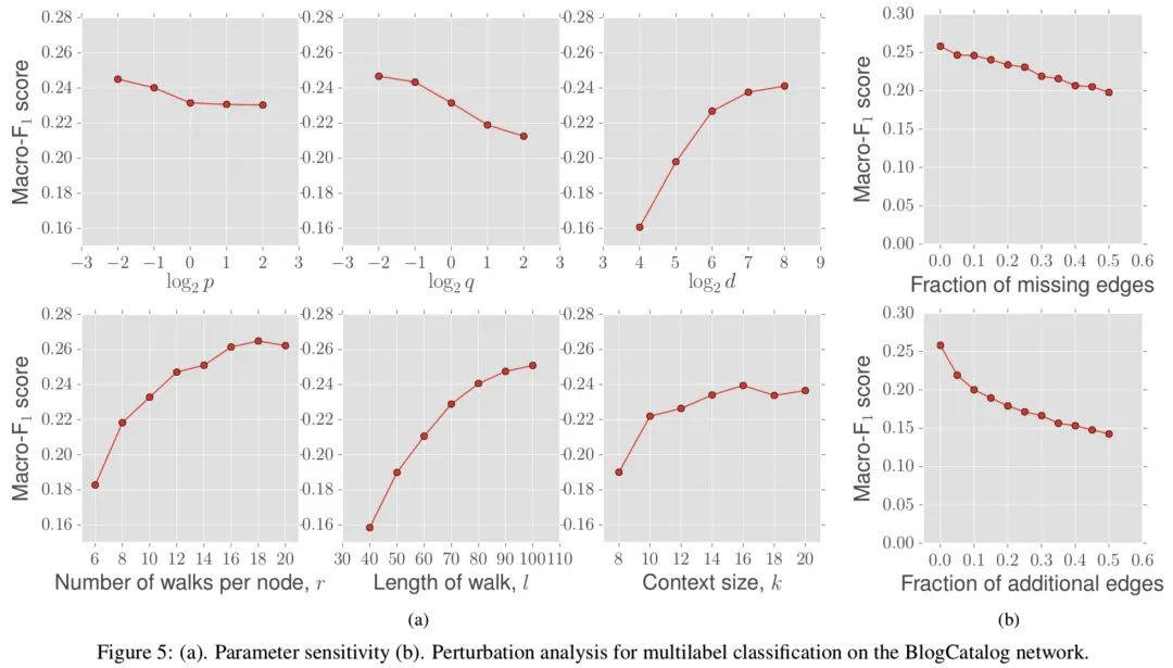低 q 倾向于向外探索,低 p 倾向于在节点附近。d 包括 r, l, k。k 就是训练词向量时的窗口大小。最后一列的两幅图分别表示缺失边和随机边。