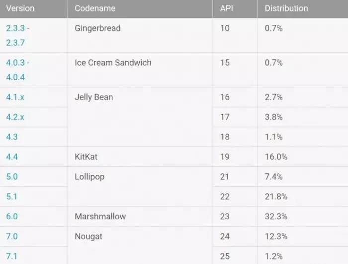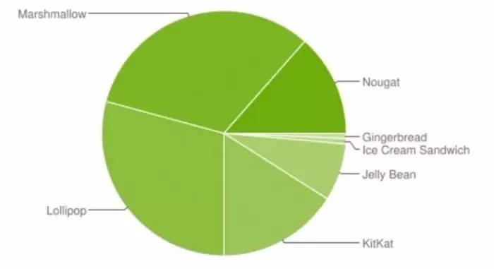 与此同时,6.0版Marshmallow已经超过了5.0版的Lollipop,占据了三分之一的份额,前者是32.3%,后者是29.2%。不过Marshmallow已经问世超过两年了,可见对Android来说进步是多么不容易。