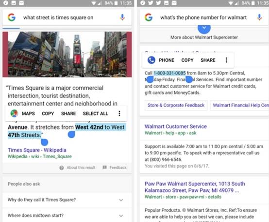 谷歌为Android 8.0增加了“智能文本选择”的功能,其可以更智能的对内容进行复制和粘贴,例如,当用户选择一个地址时,地图链接就会出现在复制、剪切、粘贴标准功能的旁边。如果用户选择的一组数字看起来很像电话号码,那么手机应用就会出现。