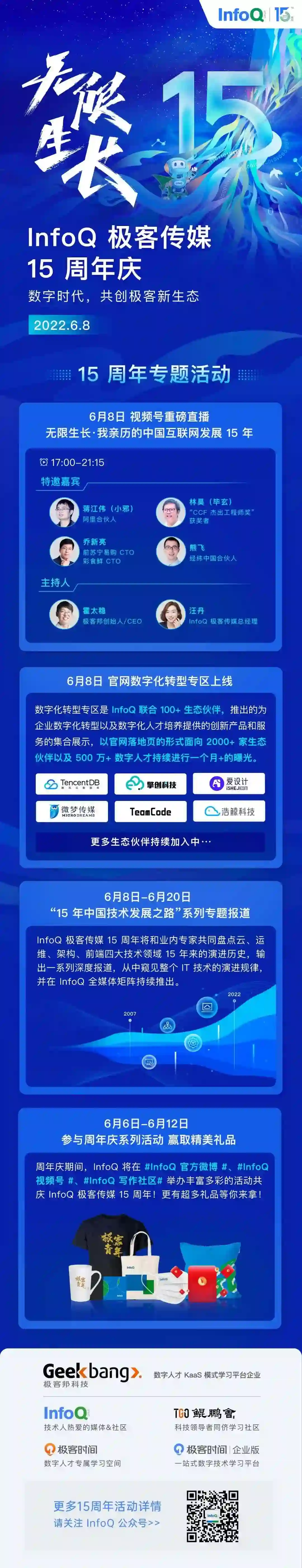在 15 周年之际,我们特别策划了 15 周年专题活动,扫下方海报二维码关注 InfoQ 公众号了解详情。