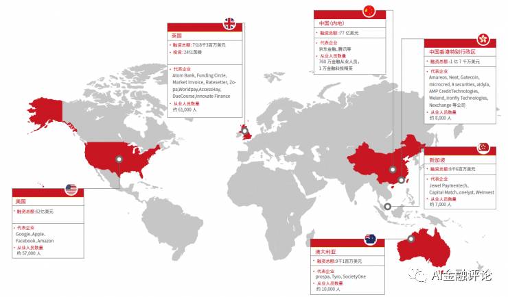 从上图可见,全球金融科技的产业中心主要分布在英国、美国、新加坡、澳大利亚和中国等国家。由于基础设施以及市场发展历史等优势,美国、英国、新加坡等地都是金融科技发展较早领先与集中的地区。
