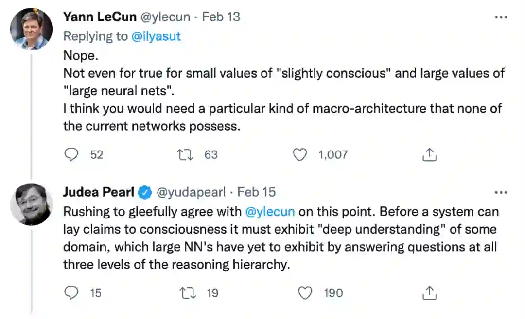 他的观点立即引起了一众 AI 大咖的讨论。针对 IIya Sutskever 的见解,图灵奖得主、Meta AI 首席科学家 Yann LeCun 首先就抛出了反对意见,给出一个直截了当的观点:「Nope.」(不。)Judea Pearl 也力挺 Lecun,表示现有的深度神经网络还无法「深度理解」某些领域。