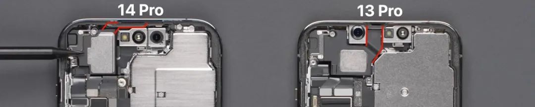 从硬件堆叠来看,之所以 Face ID 区域在这一代能进一步缩小,不是因为 Face ID 硬件变小了,而是 Apple 把距离传感器放在了屏下,并且更改了扬声器导音孔的位置,13 Pro 之前,导音孔是直接从 Face ID 中间贯穿,14 Pro 改成了从 Face ID 和上边框之间穿过,所以 Face ID 才会整体下移,总的来说就是,他要变小,一定得下移。