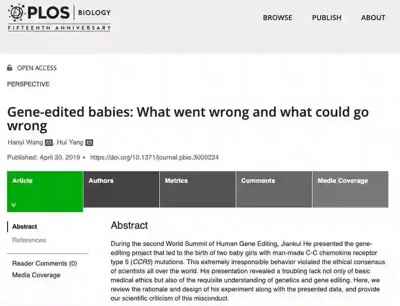 今日凌晨,两位中国学者在 PLOS Biology 发表观点文章,对贺建奎基因编辑婴儿事件进行学术性评论。这是 2018 年 11 月底贺建奎公布基因编辑婴儿诞生后,中国学者首次从科学原理、实验设计和数据的角度,在学术期刊上发表正式同行评议文章,针对这一震惊全球的科学事件发声和表态。
