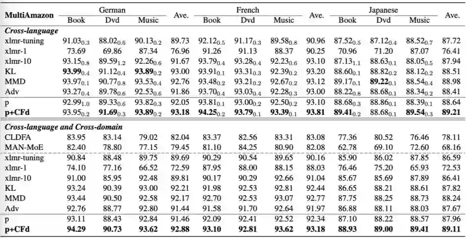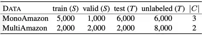 我们在文本情感分类任务上实验了提出的算法,使用到了单语言(MonoAmazon [4])和多语言(MultiAmazon [5])两个数据集。其中,单语言有 4 个 domain,包括 Book, Electronics, Beauty 以及 Music;多语言包括了英语、德语、法语和日语,每个语言包括了 Book, Dvd 和 Music 3 个 domain。