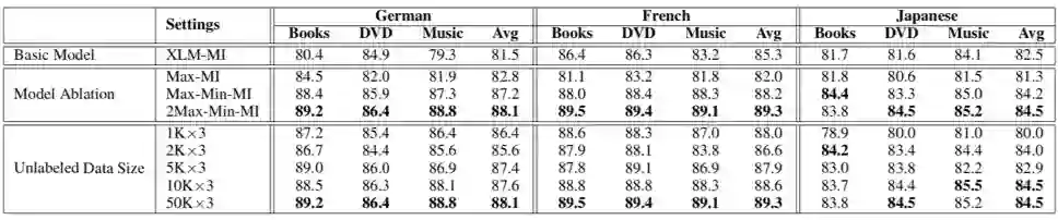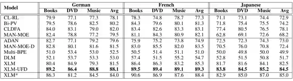上表给出了各个模型的对比实验结果(accuracy),从中我们可以看到 XLM 是一个非常强的基础模型,在最近提出的非预训练模型 MAN-MOE-D 上取得了明显的效果提升(法语和日语)。我们还观察到预训练的领域语言模型 DLM 远远弱于 XLM,这说明以语言模型为基础的表示学习手段对训练数据量级的要求很高。