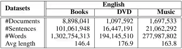 我们在文本情感分类任务上进行了实验。在实验中,我们首先使用了源语言(英语)的无标注数据(unlabeled data)[3],包括三个不同的目标领域,即 Book、Dvd、Music。该数据集用来训练 UDF,其具体的统计信息如上表所示。
