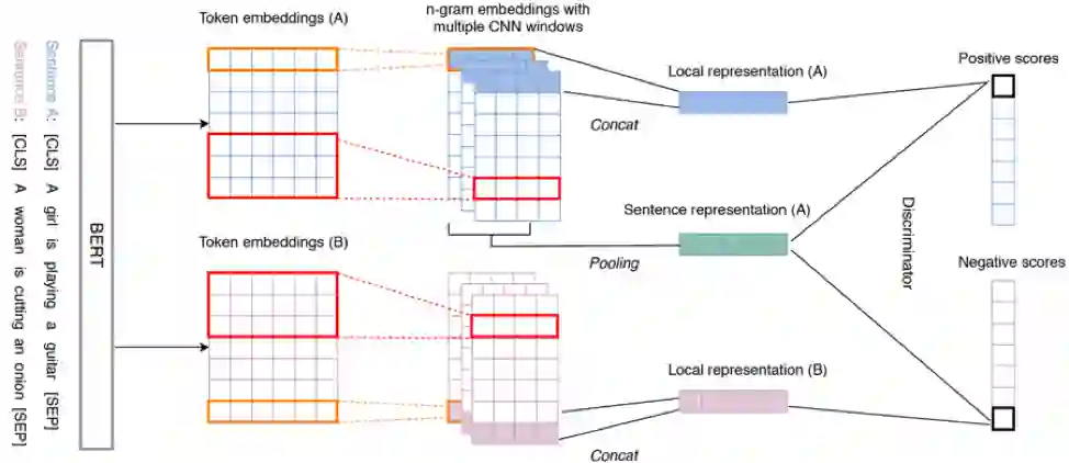 模型工作流程如下。句子输入到 BERT 后被编码,其输出的 token embeddings 通过多个不同 kernel size 的一维卷积神经网络 (CNN)得到多个 n-gram 特征。我们把每一个 n-gram 特征当成局部表征(Local representation), 将平均池化(Mean Pooling)后的局部表征称为全局表征(Global representation)。