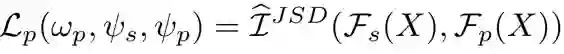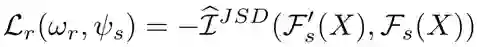 的作用是从预训练模型输出的特征中提取到领域共享(domain-invariant)的特征。我们提出通过最大化 输入和输出的互信息(mutual information (MI))这一自学习方式来训练 的参数,其损失函数 如下,这里我们用到了 Jensen-Shannon MI estimator 来估算互信息 [1] :