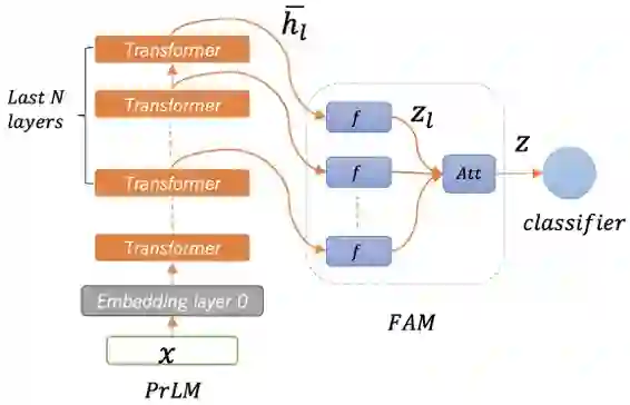 上图展示了我们模型的网络架构,其自下而上分为预训练语言模型(pretrained language model, PrLM for short),用于对输入文本进行初步编码;编码器又叫特征映射器(feature adaptation module, FAM for short),用于将预训练模型输出的特征映射到低维空间;以及分类器(classifier)。