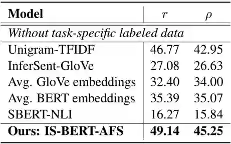 在这种情况下 SBERT 只能先在 NLI 上学习句子编码,然后在这个数据集上测试。由于 NLI 和这个 argument 数据集语义差距很大, SBERT 在这种情况下的表现很差。我们提出的 IS-BERT 由于是无监督的,可以直接在 task-specific 的无标签文本上进行训练,固而在这种场景下表现显著优于其他方法。