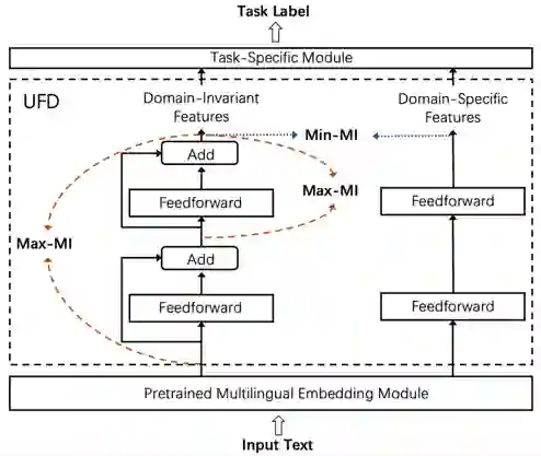 的作用是从预训练模型输出的特征中提取到领域特有(domain-specific)的特征。我们提出通过极小化 和 输出之间的互信息这一自学习方式来训练 ,通过极小化互信息, 抽取到的是完全独立于 的特征。由于 抽取的是领域共享特征, 抽取的可以被视为领域特有的特征。其损失函数如下: