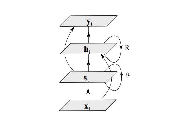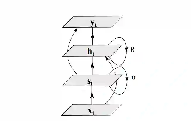 另一个解决梯度消失问题的模型是结构受限循环神经网络(structurally constrained recurrent neural network,SCRN)。这种网络基于隐藏状态在训练过程中快速变化的观察现象而设计,如图 12 所示 [6]。在这种方法中,SCRN 结构通过添加等价于单位长期依赖性关系的特定循环矩阵进行扩展。