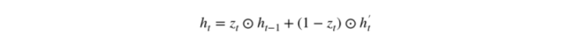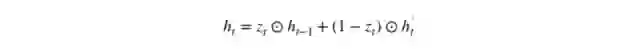 在最后一步,网络需要计算 h_t,该向量将保留当前单元的信息并传递到下一个单元中。在这个过程中,我们需要使用更新门,它决定了当前记忆内容 h'_t 和前一时间步 h_(t-1) 中需要收集的信息是什么。这一过程可以表示为: