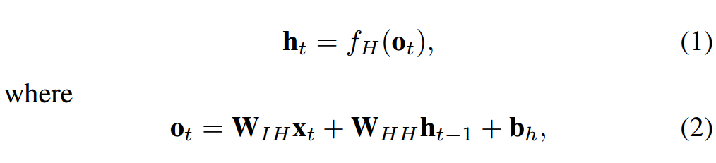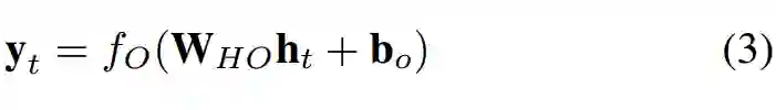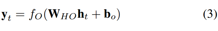 其中 f_H(·) 是隐藏层激活函数,b_h 是隐藏单元的偏置向量。隐藏单元与输出层连接,连接权重为 W_HO。输出层有 P 个单元 y_t = (y_1, y_2, ..., y_P ),可以计算为: