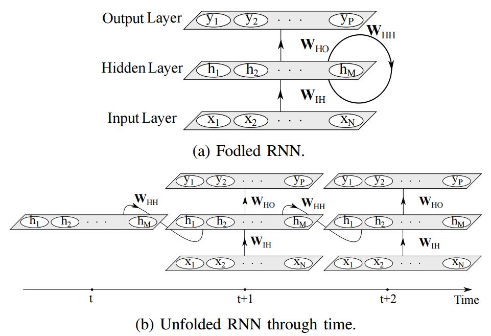 RNN 是一类监督式机器学习模型,由人工神经元和一或多个反馈循环构成 [7]。反馈循环指时间或序列(本文以下使用「时间」)的循环周期 [8],如图 1 所示。以监督式方法训练 RNN 需要一个输入-目标对的训练数据集。其目的在于通过优化网络权重最小化输出和目标对(即损失值)的差。