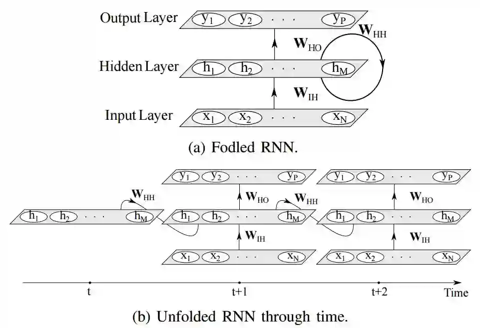 图 1:简单的循环神经网络(RNN)及其沿时间 t 的展开结构。每一个箭头代表层之间单元间的全连接。为简洁起见,本图未显示偏置项。