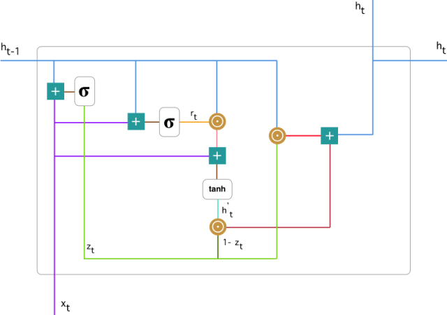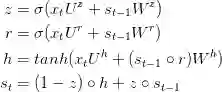 GRU 背后的原理与 LSTM 非常相似,即用门控机制控制输入、记忆等信息而在当前时间步做出预测,表达式由以下给出: