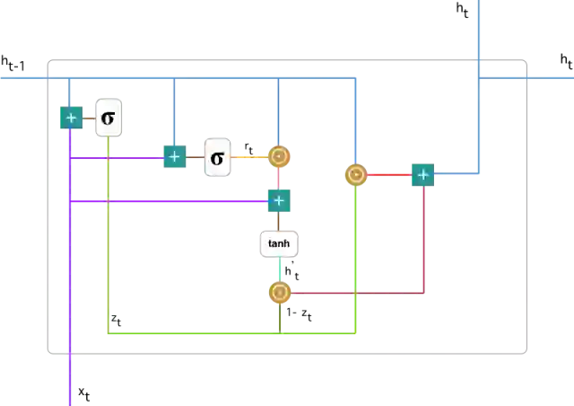 GRU 有两个有两个门,即一个重置门(reset gate)和一个更新门(update gate)。从直观上来说,重置门决定了如何将新的输入信息与前面的记忆相结合,更新门定义了前面记忆保存到当前时间步的量。如果我们将重置门设置为 1,更新门设置为 0,那么我们将再次获得标准 RNN 模型。
