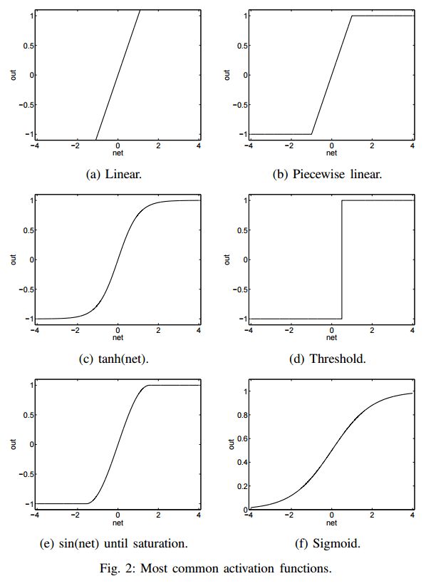 图 2 展示了一些最流行的激活函数。近期 Sigmoid、Tanh 和 ReLU 得到了更多关注。Sigmoid 函数是常见选择,它将真值归一化到 [0, 1] 区间。该激活函数常用语输出层,其中交叉熵损失函数用于训练分类模型。Tanh 和 Sigmoid 激活函数分别被定义为: