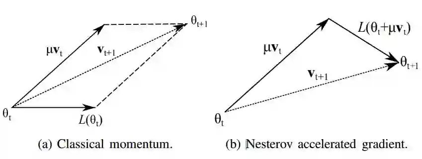 该论文还讨论了其它非常流行的 SGD 优化策略和二阶梯度优化,如下展示了一般动量法和 Nesterov 加速梯度法之间的差异。