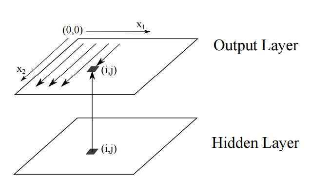 图 7:二维 RNN 的序列排序的前向传递。隐藏层平面的连接是循环的。沿 x_1 和 x_2 的线展示了(从左上角开始)被访问的过去状态的扫描带。