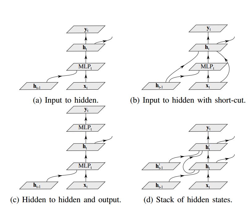 图 5:几种结合多层感知机的深度循环神经网络的架构。