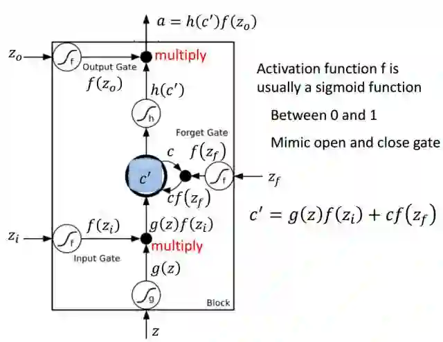 以下是 LSTM 单元的详细结构,其中 Z 为输入部分,Z_i、Z_o 和 Z_f 分别为控制三个门的值,即它们会通过激活函数 f 对输入信息进行筛选。一般激活函数可以选择为 Sigmoid 函数,因为它的输出值为 0 到 1,即表示这三个门被打开的程度。