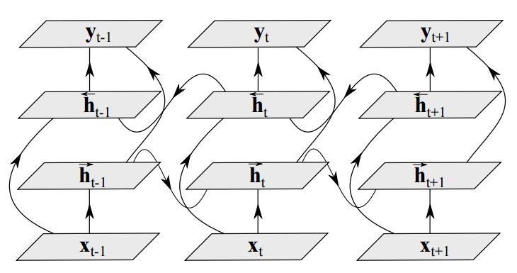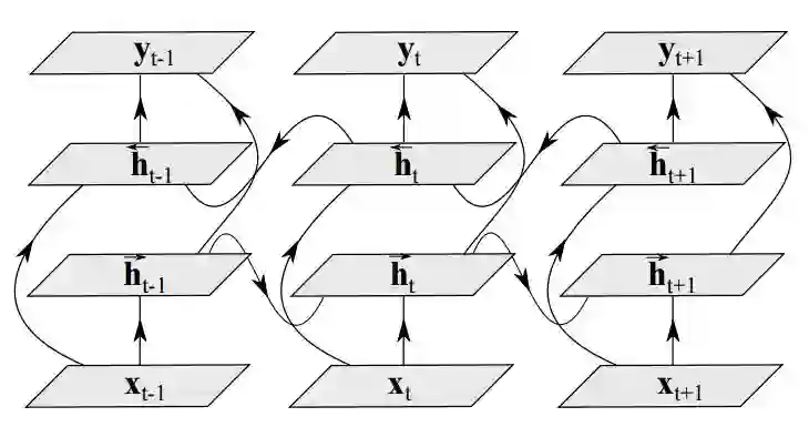 传统的 RNN 在训练过程中只考虑数据的过去状态。虽然在很多应用中只考虑过去状态已经充分有效(例如语音识别),但是探索未来的状态也是很有用的 [43]。之前,人们尝试通过对输出延迟确定时间帧数,以在 RNN 的基础架构上利用未来状态作为当前预测的环境。然而,这种方法需要在所有的实现中手动优化延迟时间。而双向 RNN(BRNN)利用了过去和未来的所有可用输入序列评估输出向量 [46]。其中,需要用一个 RNN 以正向时间方向处理从开始到结束的序列,以及用另一个 RNN 处理以反向时间方向处理从开始到结束的序列,如图 6 所示。