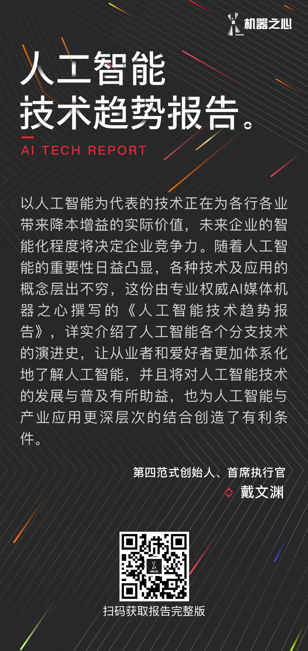 机器之心发布首份《人工智能技术趋势报告》,纵览人工智能的 23 个分支技术。明晰历史发展路径,解读现有瓶颈及未来发展趋势。点击阅读原文,立即获取报告完整版。
