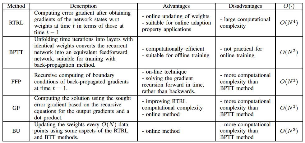 有效地训练 RNN 一直是重要的话题,该问题的难点在于网络中难以控制的权重初始化和最小化训练损失的优化算法。这两个问题很大程度上是由网络参数之间的关系和隐藏状态的时间动态而引起 [4]。本论文文献综述所展现的关注点很大程度上都在于降低训练算法的复杂度,且加速损失函数的收敛。然而,这样的算法通常需要大量的迭代来训练模型。训练 RNN 的方法包括多表格随机搜索、时间加权的伪牛顿优化算法、梯度下降、扩展 kalman 滤波(EKF)[15]、Hessian-free、期望最大化(EM)[16]、逼近的 Levenberg-Marquardt [17] 和全局优化算法。在这一章节中,本论文具体讨论了这样一些方法。