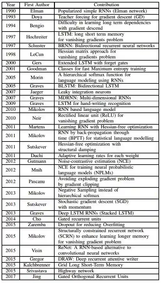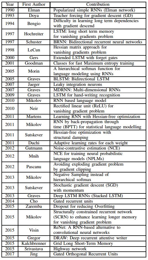 从架构设计到应用开发,关于 RNN 的文献已经有大量的论文发表。在本文中,作者重点讨论了离散时间的 RNN 和该领域的最新研究进展,并在表 1 中列出了 RNN 的长期主要进展。反向传播和梯度下降方法的开发使得训练 RNN 变得很高效,加快了开发 RNN 的实际成就 [5]。然而,对长期依赖的序列数据还存在一些挑战,例如梯度消失和梯度爆炸问题,本文将讨论这些问题。