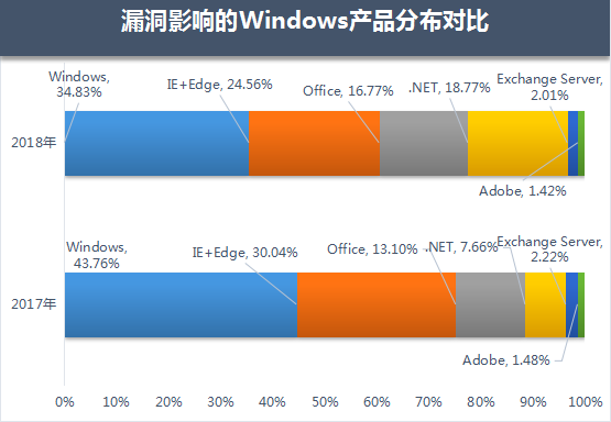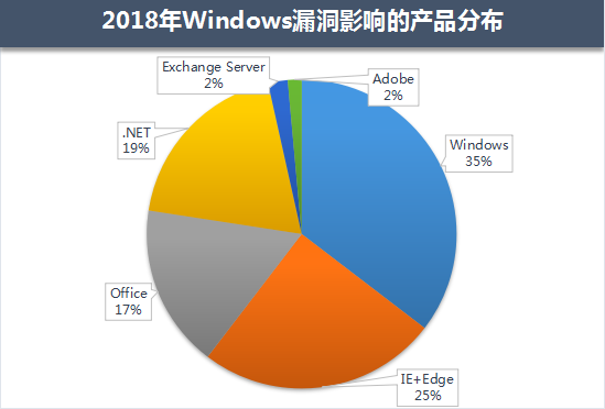 2018年,在所有漏洞影响的Windows产品中,Windows系统组件漏洞占到了35%的比例,浏览器漏洞占25%,Office漏洞则占比17% 。