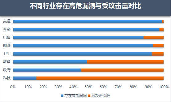 从受攻击量的对比数据看,政府、教育、医疗卫生行业因为其系统存在大量高危漏洞未及时修复,所受攻击次数也相对较高。而科技行业虽然漏洞存在量相对较少,受攻击量却是最高的,这样从另一方面说明,漏洞利用攻击者通常是有目的针对性地采取攻击,对科技行业的攻击,泄取机密往往成为首选目的。