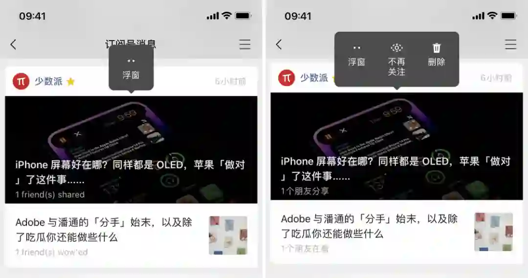 这个改动让我们终于可以在「订阅号消息」对所关注的订阅号、文章进行修改。既可以更方便地取关某些公众号,也可以把一些已经读过且不具复读价值的内容给删掉,让「订阅号消息」里少一些不想看到的内容。