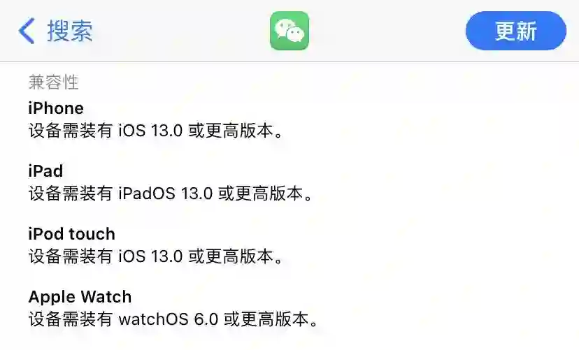 在 8.0.30 版本中,微信则将最低系统要求从 iOS 12.0 提升到了 iOS 13.0。这也就意味着,手持 iPhone 6 及更早设备的用户,将无缘后续更新。
