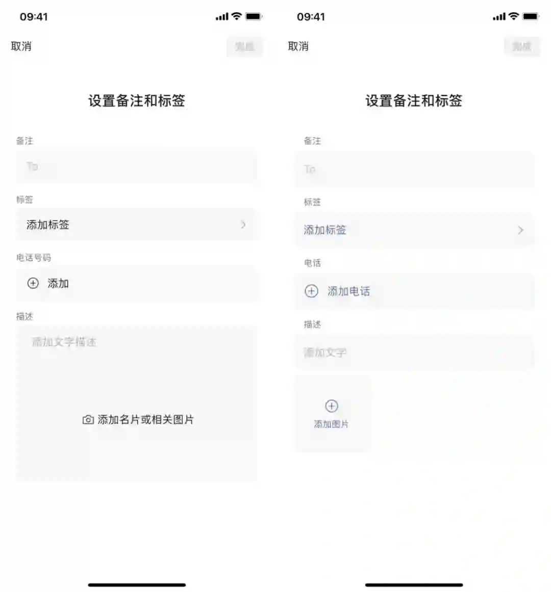 微信的此次更新还调整了好友「备注与标签」界面底部的「添加图片」功能,从原先的大矩形换成了九宫格式的圆角矩形,并且支持从聊天中选择图片。
