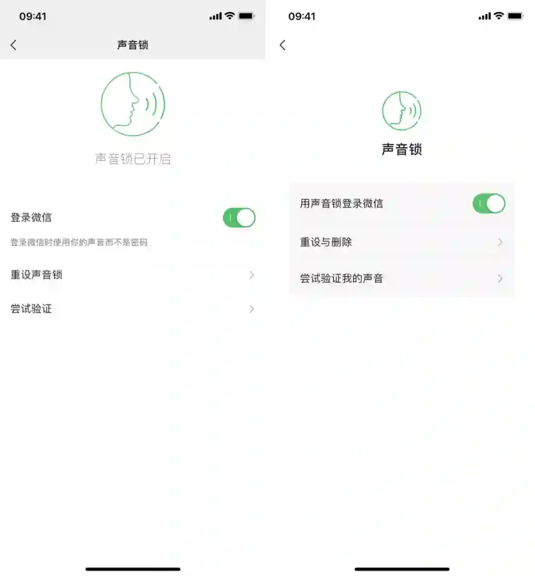 在微信「我 > 设置 > 账号与安全」里有一个「声音锁」的功能,它可以通过录入你的声音来验证身份。在登录微信时,可以用作密码、验证码之外的验证方法来登录。