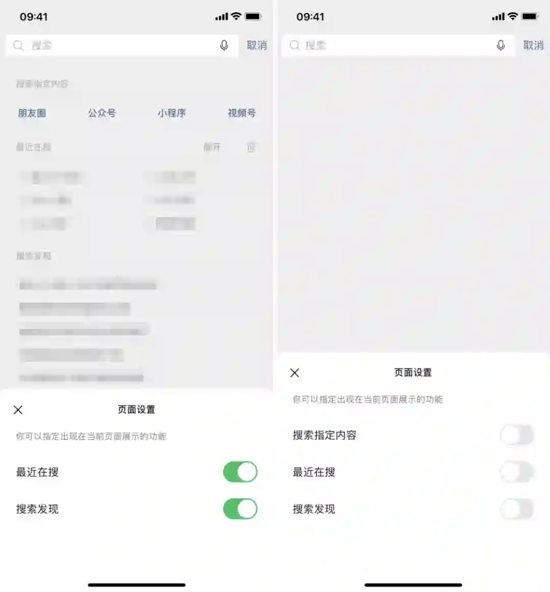 微信 8.0.29 支持关闭「最近在搜」和「搜索发现」模块,在 8.0.30 版本中则支持关闭「搜索指定内容」。全部关闭后,你将会获得一个完全空白的搜索界面。