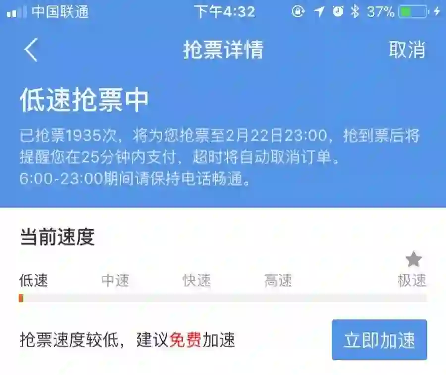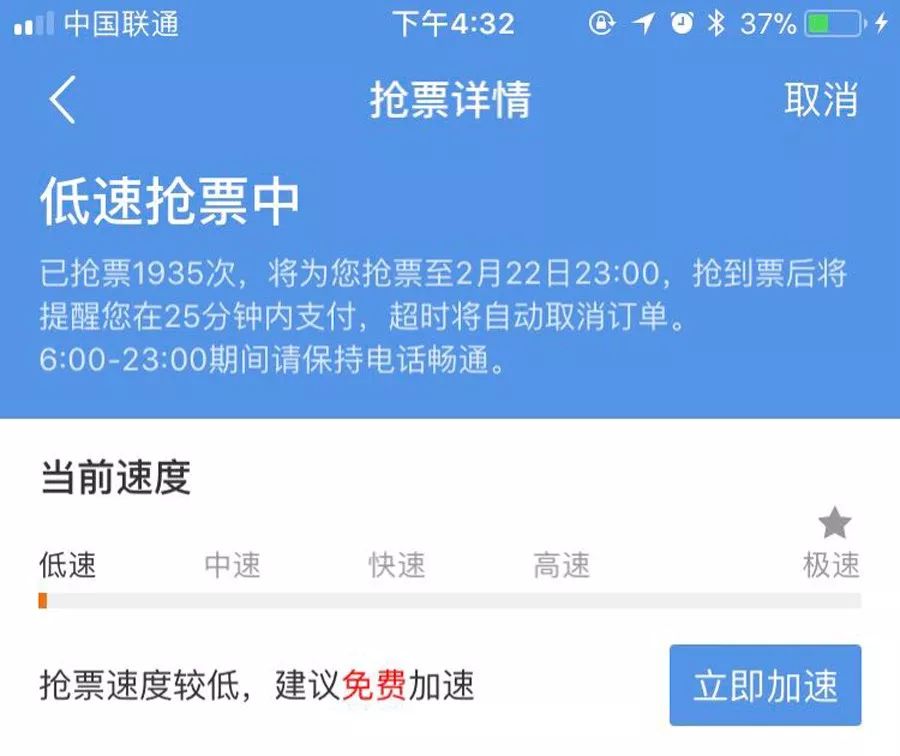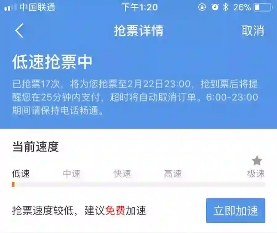 不光给出抢票次数,还给出你现在所处的速度等级,低速、中速、快速、高速、极速,还特明显的标注出你所处位置是最低位置,然后建议你免费邀请好友加速或者花钱加速。