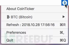 从表面上看,CoinTicker应用程序似乎是一个合法的应用程序,可能对投资加密货币的人有用。下载后,该应用程序会在菜单栏显示一个图标,显示当前比特币价格的信息。